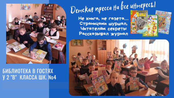 Для того, чтобы познакомить детей с детской периодикой, наша библиотека отправилась в гости к ребятам 2-х классов школы №4. Дети посмотрели видеообзоры журналов, подготовленные специалистами библиотеки. Из рассказа библиотекаря ребята узнали о толковании слова «журнал», почему журналы и газеты называют периодическими изданиями, какие интересные для младших школьников издания можно почитать в нашей библиотеке. А мы ждём ребят с ответным визитом к нам в библиотеку.