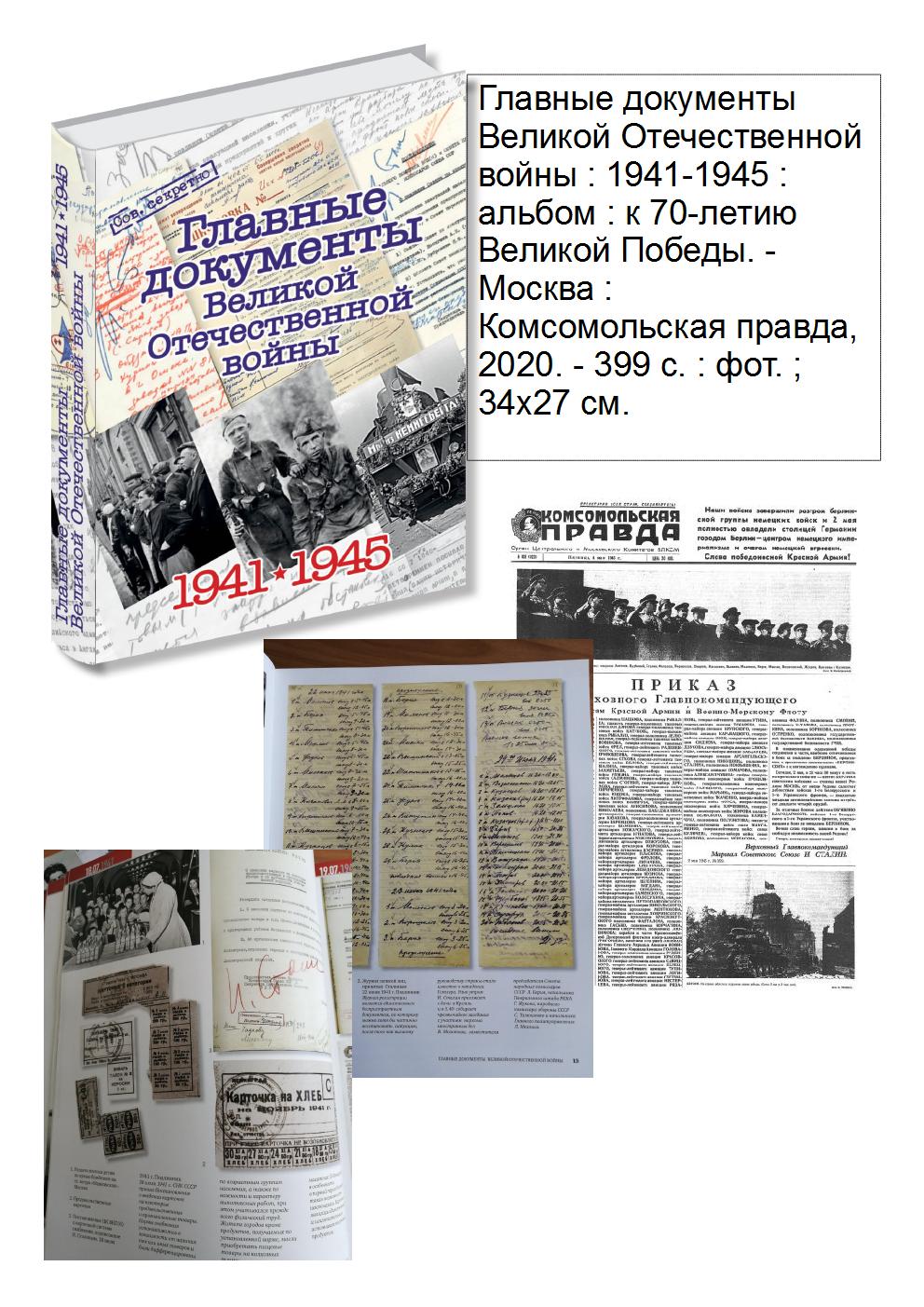 Главные документы Великой Отечественной войны: 1941-1945: [альбом: к 70-летию Великой Победы / вступительное слово, руководитель проекта Владимир Сунгоркин; автор и составитель Владимир Долматов; редактор Андрей Дятлов; составитель-консультант Людмила Лыкова; дизайн Александра Кулакова]. — Москва : Комсомольская правда, 2020. — 399 с. : фот. ; 34х27 см. — 3000 экз. — ISBN 978-5-87107-966-9 (в пер.)