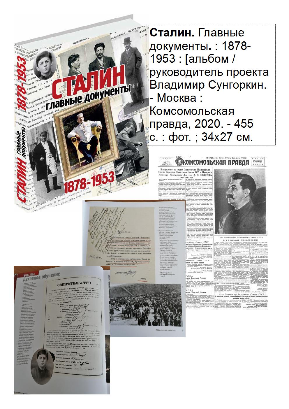 Сталин. Главные документы. : 1878-1953 : [альбом / руководитель проекта Владимир Сунгоркин ; автор и составитель Владимир Долматов ; редактор Андрей Дятлов ; консультант Людмила Лыкова ; дизайн Александр Кулаков ; фотограф Василий Дорофеев]. — Москва : Комсомольская правда, 2020. — 455 с. : фот. ; 34х27 см. — 2000 экз.