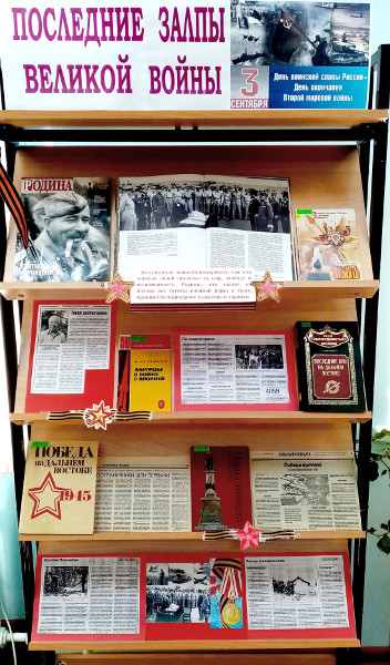 Об этом и о многом другом, связанном с этой исторической датой, говорилось на информационном часе для сотрудников полиции г. Зеи. Кроме того, присутствующие познакомились с изданиями и материалами, представленными на краеведческой книжной выставке «Последние залпы Великой войны», посвященной окончанию Второй мировой войны.