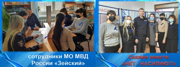 Сотрудники МО МВД России «Зейский» присоединились к акции «Нет насилию!» и вместе с работниками библиотеки приняли участие в информационной встрече с жителями города, на которой рассказали об истории акции, о нормативно-правовых актах, которые устанавливают права, гарантии граждан по данному вопросу.