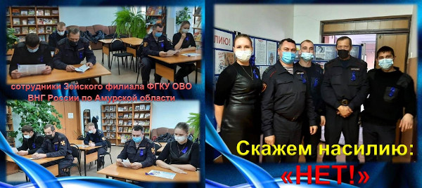Откликнулись на призыв поддержать акцию «Нет – насилию!» и сотрудники Зейского филиала ФГКУ ОВО ВНГ России по Амурской области, прикрепляя к форме синие ленты они поинтересовались почему ленты имеют именно синий цвет. В ходе беседы и ознакомления с тем, каким бывает насилие, они узнали и о истории появления акции «Синяя лента».