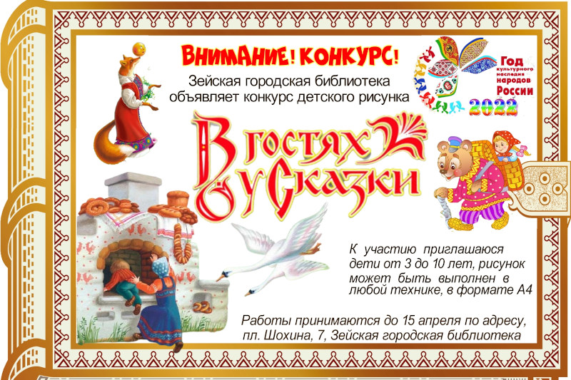 Зейская городская библиотека объявляет о проведении конкурса детского рисунка «В гостях у сказки». Для участия в конкурсе приглашаются дети в возрасте от 3 до 10 лет. С условиями и порядком проведения конкурса можно ознакомиться в Положении (PDF, 36Кб).