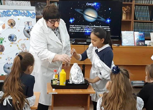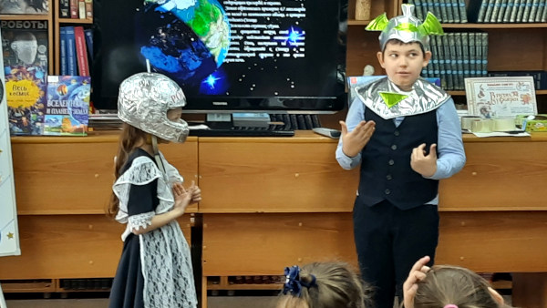 В космическое путешествие по просторам нашей солнечной системы отправились ребята 3Б класса школы № 5. Прозвучал сигнал «Старт!» и дети активно включились в игровую программу. На каждой планете их ожидало необычное приключение, ребята узнали много интересного о звёздах, планетах и других небесных телах. Юные космонавты с восторгом принимали участие в играх и конкурсах, отгадывали загадки от Белки и Стрелки – первых космических собак-путешественников, пытались при помощи жестов общаться с инопланетянами, узнали, что едят космонавты во время полётов. В гости к ребятам заглянул профессор Почемучкин, который рассказал о планете Сатурн и при помощи простого химического опыта показал, как происходит извержение вулканов, которые есть не только на нашей планете.