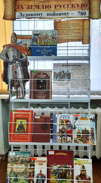 «За землю Русскую» — так называется книжная выставка, посвященная Победе русских воинов князя Александра Невского над немецкими рыцарями в битве на Чудском озере 1242 года. Выставка организована в рамках областной литературно-познавательной эстафеты «Отечеству верные сыны» к 780-летию Ледового побоища.