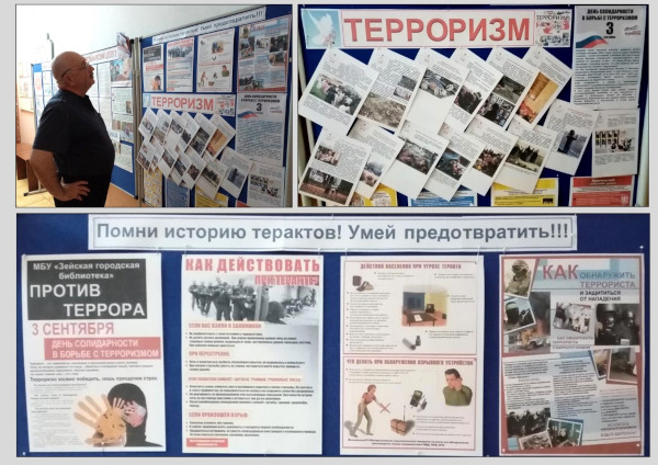 Зейская городская библиотека приняла эстафету в поддержку борьбы против терроризма. В холле библиотеки размещен стенд, который будет интересен всем желающим узнать гораздо больше по этой теме. Ведь на стенде представлена как основная информация о Дне солидарности в борьбе с терроризмом, так и основные трагические события, которые в календарях неравнодушных людей отмечены днями скорби по погибшим в результате терактов граждан нашей страны. Здесь же в доступной форме размещены основные памятки к действию в той или иной ситуации, связанной с угрозой жизни и деятельности людей.
