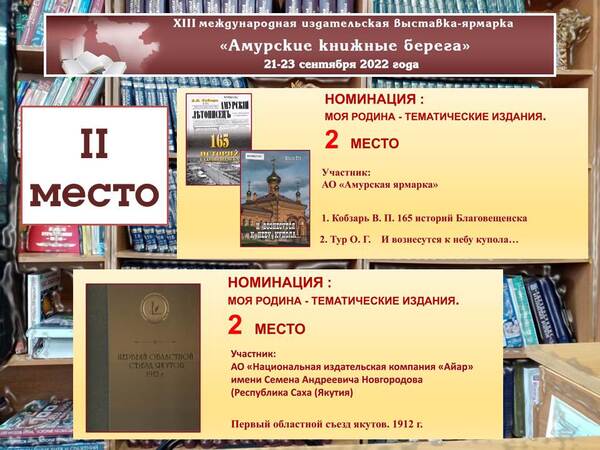 23 сентября в рамках проходящей в Амурской областной научной библиотеке XIII международной издательской выставки-ярмарки «Амурские книжные берега» состоялось подведение итогов и награждение победителей Конкурса изданий и полиграфической продукции.