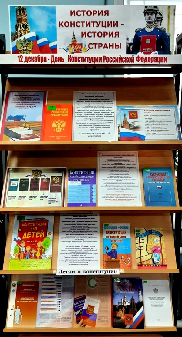 К этому празднику в нашей библиотеке в справочно-информационном отделе была оформлена книжно-информационная выставка «История Конституции – история страны». На ней представлен экземпляр конституции в новейшей редакции со всеми поправками, а также предыдущие ее варианты. Также можно познакомиться с конституционным правом в нашей стране, информацией об истории принятия конституции в разные годы – от Ленина до Брежнева.