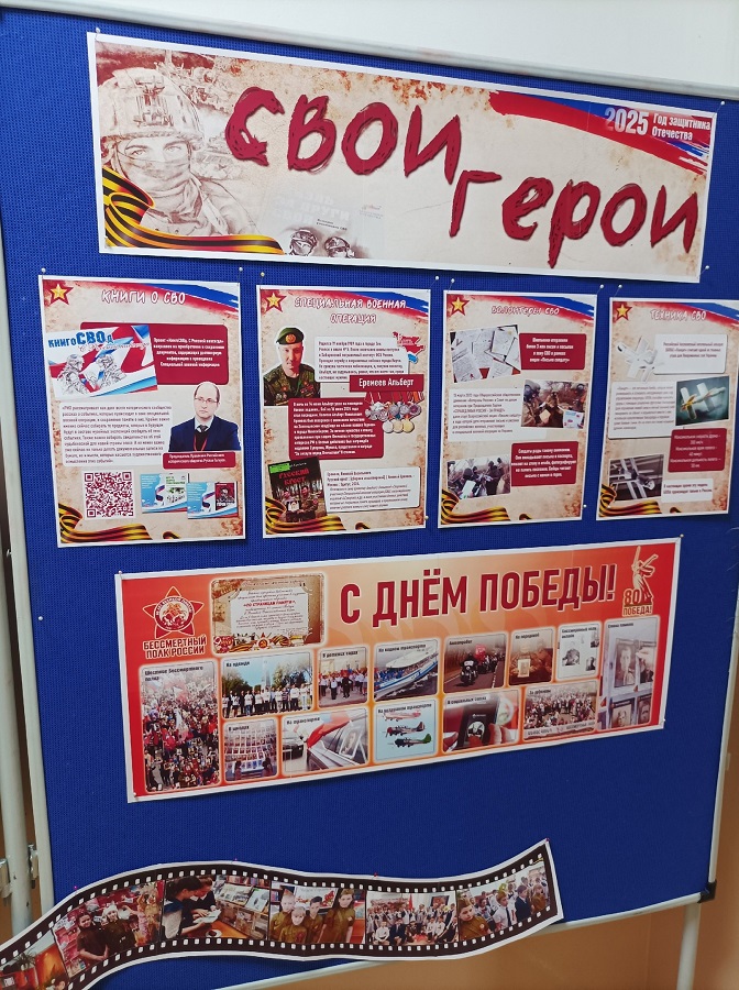 Одна из страниц стенда «Свои герои» посвящена Специальной военной операции. В дополнение к информационному стенду представляем проект «КнигоСВОд. С Россией навсегда», который собрал в себе книги по теме СВО из фонда библиотеки.