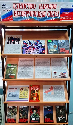 В преддверии Дня воссоединения Донбасса и Новороссии с Российской Федерацией в библиотеке открылась книжная информационная выставка «Единство народов – несокрушимая сила!». Она посвящена очень важному для нашей страны событию, тому, как 30 сентября 2022 года четыре южных региона – Донецкая и Луганская народные республики, Херсонская и Запорожская области – вновь стали частью Российской Федерации. Решение о вхождении этих территорий в состав России было принято на основе результатов референдумов, где жители этих регионов выразили свою поддержку этому решению. Теперь дата 30 сентября ежегодно отмечается как День воссоединения.
