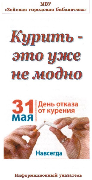 В нашей библиотеке к Всемирному дню без табака подготовлен информационный указатель «Курить – это уже не модно!». В нем вашему вниманию предлагаются книги и журналы, призванные помочь бросить курить. Они не просто призывают избавиться от вредной привычки, но интересно, ненавязчиво рассказывают о том вреде, который мы сами себе наносим. Советы, которые даются в этих изданиях, просты и выполнимы. От нас только требуется найти в себе силу воли и начать следовать им.