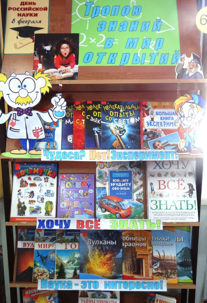На абонементе нашей библиотеки представлена детская книжная выставка, посвященная празднику — Дню российской науки. Для юных экспериментаторов на выставке представлены книги: «Большая книги экспериментов», «Большая книга научных развлечений», серия «Увлекательные опыты». Это великолепные сборники простых и безопасных, но крайне интересных и познавательных экспериментов, заданий, забавных фактов посвящает читателей в мир астрономии, биологии, химии, географии, физики. Руководствуясь книгами, юные исследователи не только сами смогут сами поставить опыты, но и узнать о природе каждого из них.