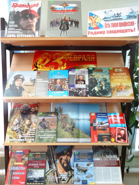К этой дате в нашей библиотеке оформлена тематическая книжная выставка «Есть такая профессия – Родину защищать». Яркая по своему оформлению, но очень значимая по смыслу, книжная выставка охватила исторические моменты возникновения Советской Армии. Она будет интересна тем, кто желает больше узнать о новом облике Российской армии и настоящей мужской профессии. На выставке представлены книги о великих русских полководцах и адмиралах, великих сражениях на море и на суше, а также книги об истории становления русского воинства и воинских ритуалах.