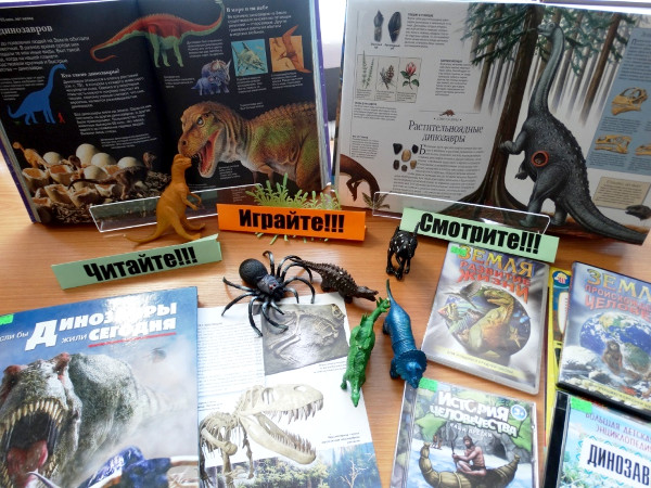 Дети всегда интересуются книгами о динозаврах и вымерших животных, они в большом количестве представлены на выставке. Но эта выставка необычна – здесь можно в руках подержать динозавра, правда игрушечного, и посмотреть фильмы и электронные энциклопедии о доисторическом мире.