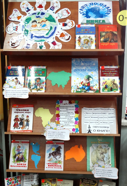 Ко Дню Детской книги в нашей библиотеке приурочены книжная выставка «Книга шагает по планете». Цель выставка – наглядно показать юному читателю связь стран и народов, международное значение книги. Мы попытались показать наличие в нашем книжном фонде детских книг авторов разных континентов и стран: на первой полке расположились книги авторов, проживающих в Евразии, на втором – Африки, на третьем Северной и Южной Америки и Австралии. Эта выставка познакомит юных читателей с ещё неизвестными им авторами.