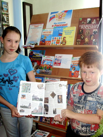 В читальном зале библиотеки оформлена детская книжная выставка «Мы живем в России» На выставке представлена Конституция и гимн России, символы России. Дети познакомятся с лучшими книгами по истории России. Следующий раздел выставки посвящен народам России, ведь более 100 различных народов проживают в современной России. И мы гордимся своей многонациональной страной.